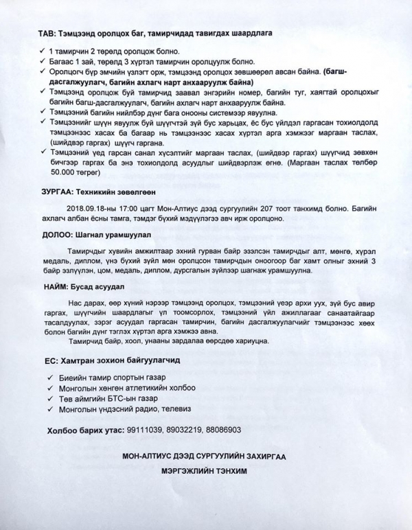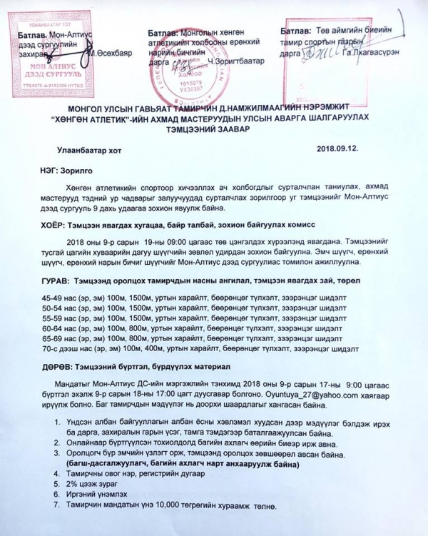 МОНГОЛ УЛСЫН ГАВЪЯАТ ТАМИРЧИН Д.НАМЖИЛМААГИЙН НЭРЭМЖИТ ХӨНГӨН АТЛЕТИКИЙН "АХМАД МАСТЕРУУД-2018" 9 ДЭХЬ УДААГИЙН ТЭМЦЭЭН 2018.09.19 Төв Цэнгэлдэх Хүрээлэн